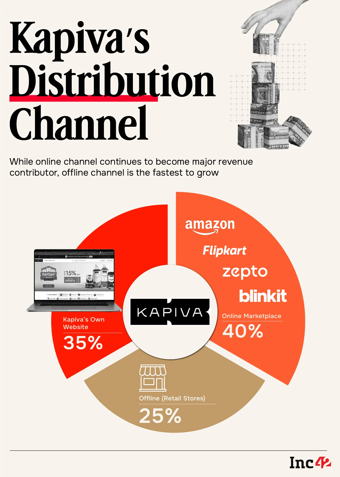Kapiva generates about 35% of its revenue from its own website, 40% from online marketplaces, including quick commerce platforms, and the remaining 25% from offline channels. Offline retail, particularly department stores, turned out to be the fastest-growing segment as the company scales its physical presence across the country.